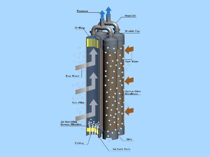 浸沒式系列產(chǎn)品采用 TIPS 法制備的 PVDF 中空纖維超濾膜,具有大通量、高強度,耐藥洗等特點,全開放設計,減少了污染物沉積,進水濁度范圍更寬;組件系統(tǒng)整體浸沒于過濾水體中,曝氣集水一體化,省卻了復雜的管路及支架,使安裝維護省時省力;集成化專利技術裝備,降低了膜池占地面積,其單套處理能力在市場同類產(chǎn)品中最高。
